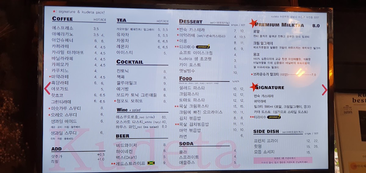 Welcome to Cafe Kudeta, a hidden gem nestled right at 199-1 Sanseong-daero, Sujeong-gu, Seongnam-si, Gyeonggi-do, South Korea. This cafe isn't just a stop for coffee; it's an eclectic experience! The unique décor, a blend of vintage and modern elements, creates an inviting atmosphere that feels both exotic and homey.